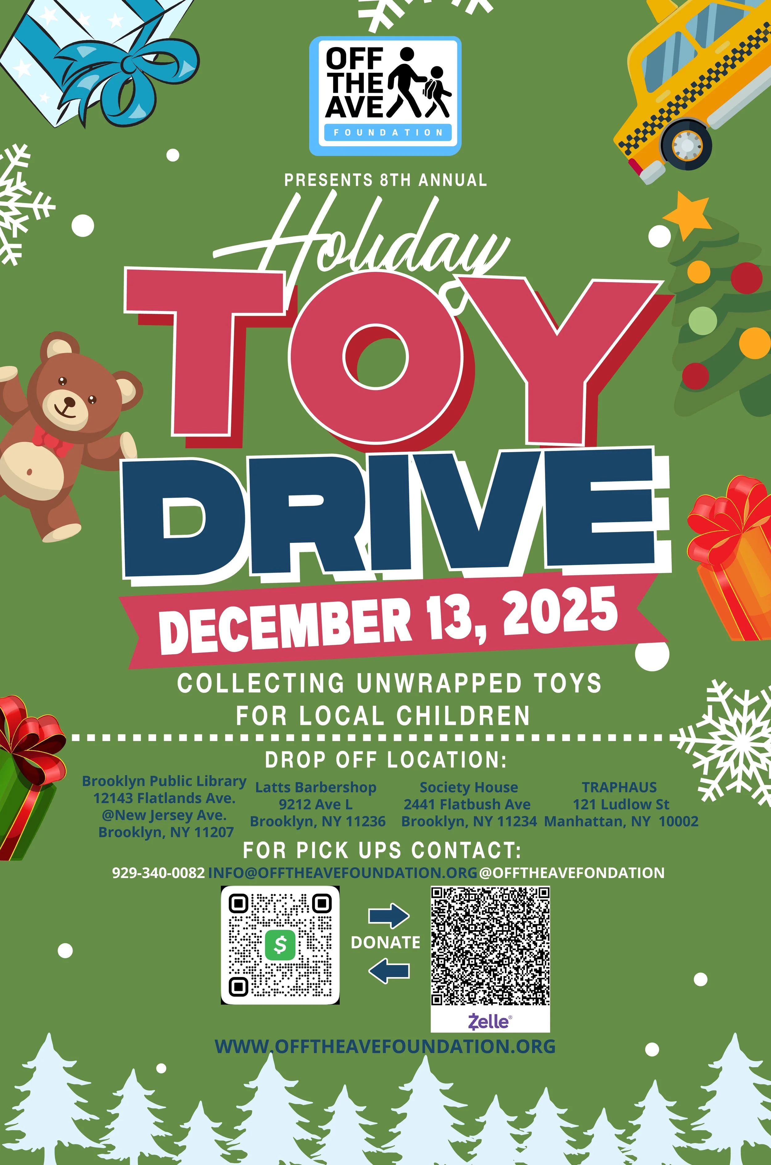 Please donate unwrapped toys to be distributed at our annual Holiday Toy giveaway party, drop-off locations provided on flyer for pick ups please call. We believe every kid deserves to be filled with the joy of the holiday spirit.